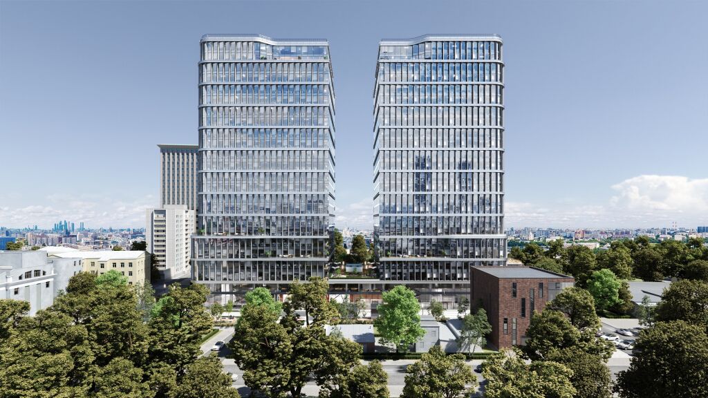 Архитектурная концепция формирует выразительный силуэт и подчеркивает современный характер объекта. В проекте реализованы озеленённые террасы на 3, 4, 5, 7 и 23 этажах общей площадью более 1,5 тыс. кв. м, панорамное остекление, высокие потолки и гибкая планировка.